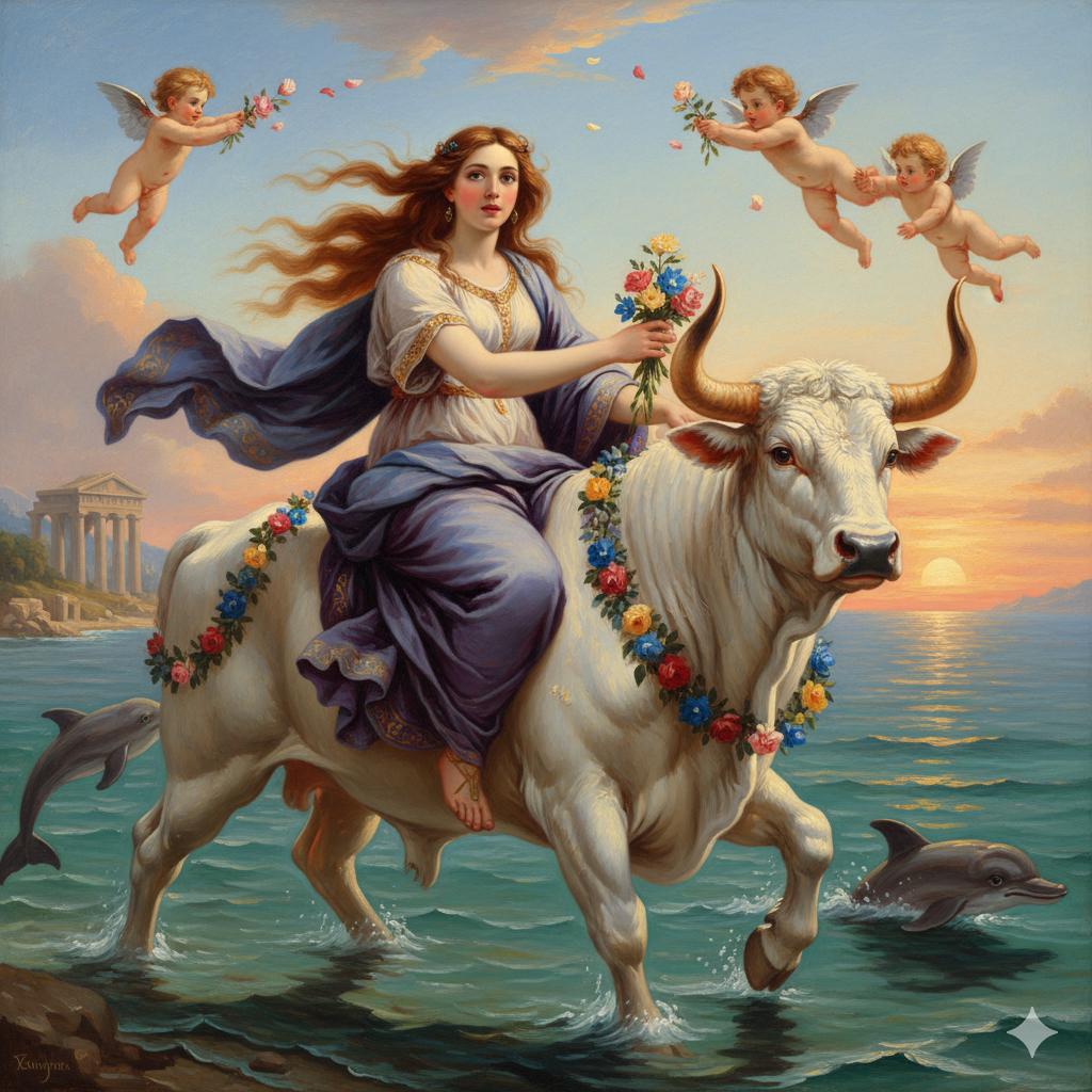 Et le début du récit met en scène Zeus qui, déguisé en taureau, enlève Europe, fille d’Agénor, roi de Tyr ou de Sidon en Phénicie, se rend en Crète par la mer, s’unit à elle pour lui donner trois fils d’exception ; Minos, Sarpédon et Rhadamante.