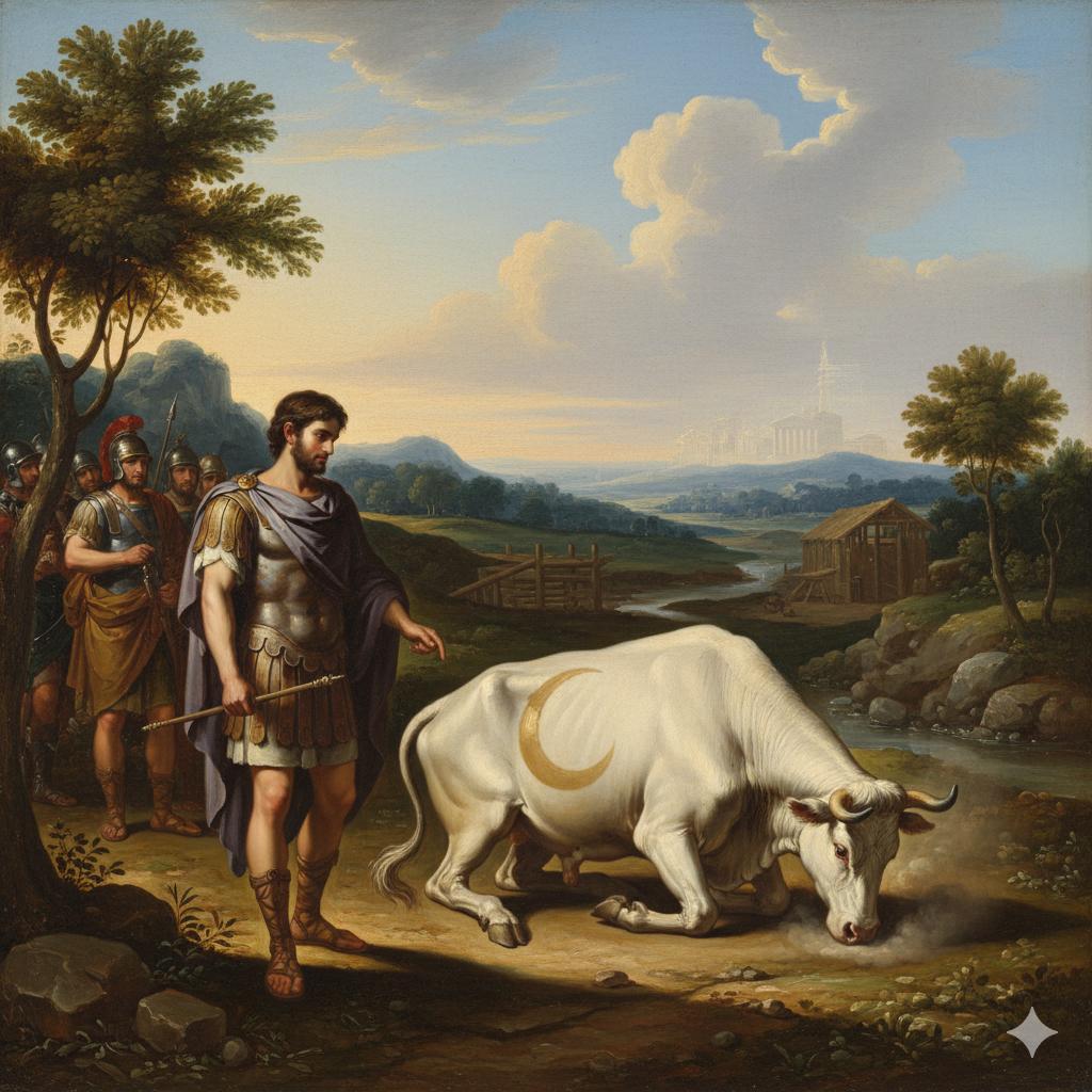 Conformément à l’oracle il aperçut une vache portant le signe de la lune sur les flancs qu’il suivit jusqu’à ce qu’elle s’affaisse en Béotie.