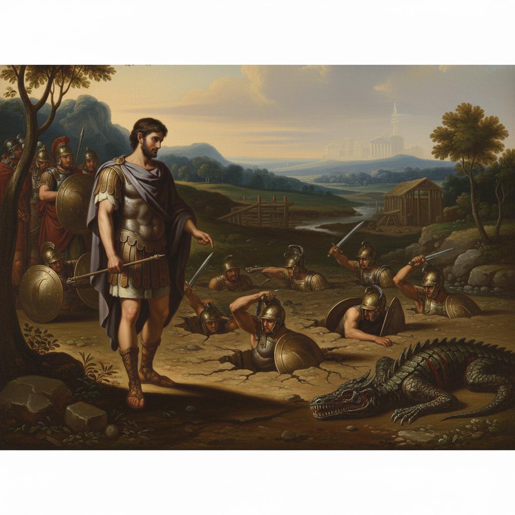 En effet Cadmos ayant donc trouvé le site de la future ville de Thèbes, envoya ses compagnons chercher de l’eau à une source voisine afin d’offrir à Athéna un sacrifice de fondation. Or la source appartenant à Arès était gardée par un dragon menaçant que Cadmos tua.