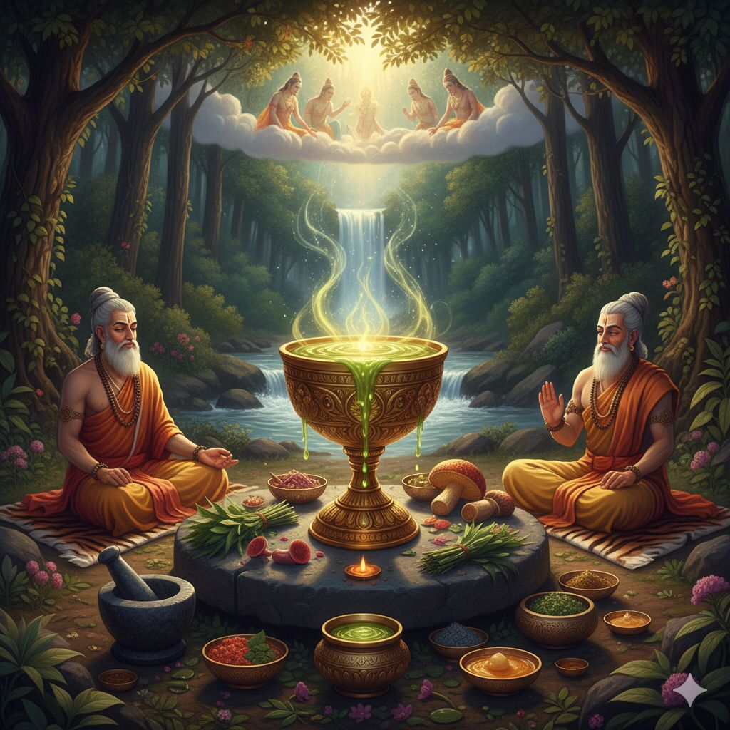 On pense immédiatement au dieu élixir Soma très en lien avec la période védique et l’hindouisme mais qui reste central dans certaines conceptions bouddhistes de « nectar d’immortalité » (nectar d’immortalité se substituant au Soma).