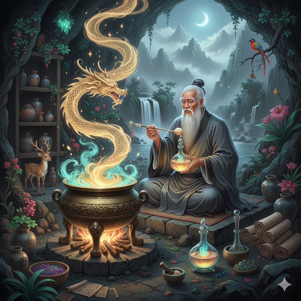 Les taoïstes ont recherché leur équivalent du Soma à travers la collecte de plantes et la confection de leur « élixir de longue vie », puis, à l’instar des rishis indiens adeptes des Upanishads, ils ont cherché à sécréter leur propre élixir intérieur véritable « élixir d’immortalité ».